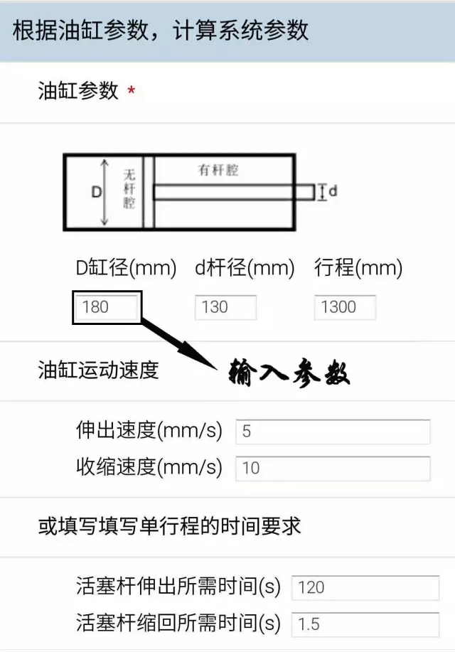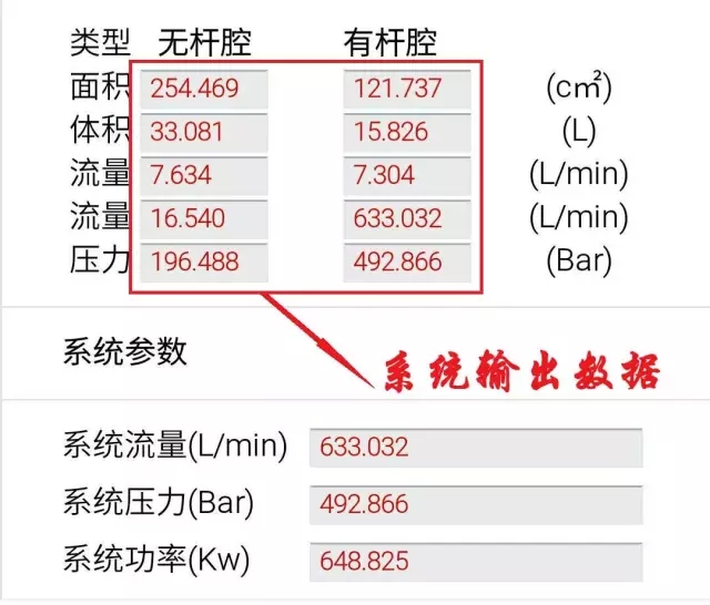 在液壓系統(tǒng)計算器里,輸入油缸的基本參數(shù),計算器自動輸出液壓系統(tǒng)流量、壓力、功率。 “黑色的”為您需要輸入的數(shù)據(jù),“紅色的”為系統(tǒng)自動計算的數(shù)據(jù)。