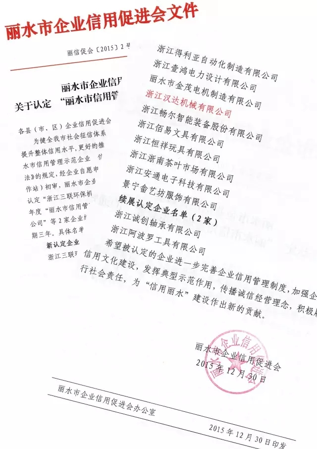 恭賀浙江漢達榮獲“麗水市信用管理示范企業(yè)”